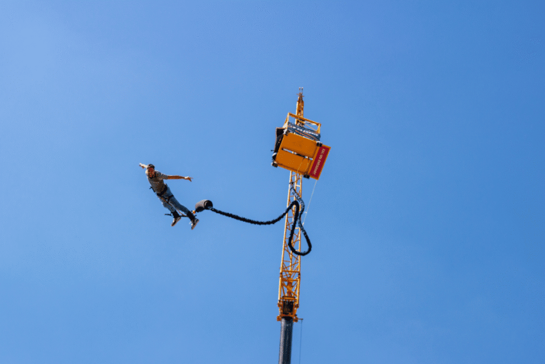 Bungee jumping: salto de uma plataforma elevada por guindaste, preso por um cabo elástico.