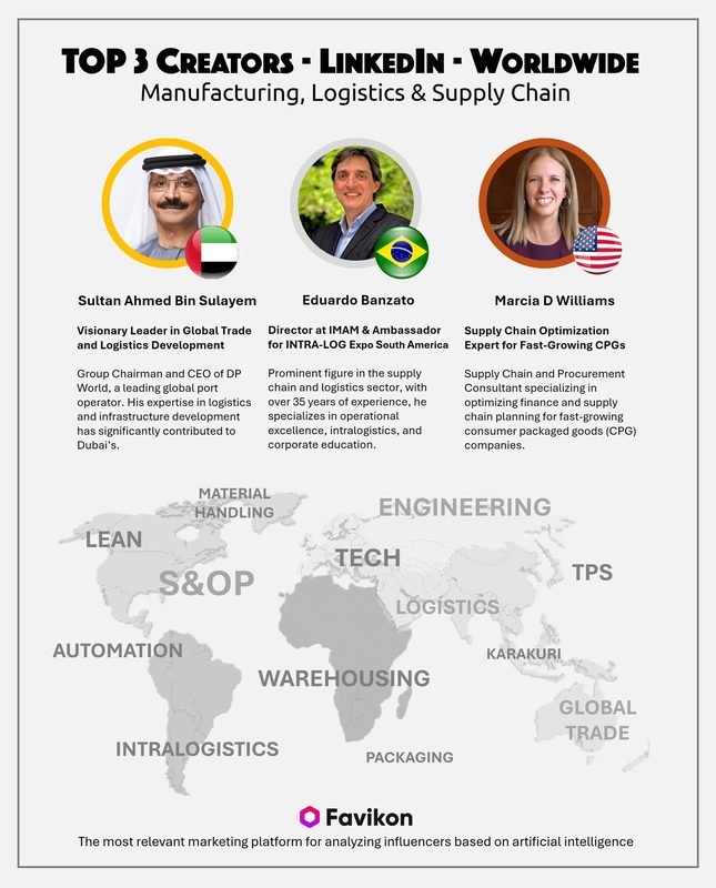 A plataforma Favikon é dinâmica e altera os TOP 3 continuamente e a composição do ranking em 06 de agosto, destacando os 3 maiores “influencers” mundiais no LinkedIn. No setor de “Manufacturing, Logistics & Supply Chain” foram: Sultan Ahmed Bin Sulayem (CEO da DP World – EAU), Eduardo Banzato (Diretor do IMAM – Supply Chain, Logística e Intralogística – Brasil) e Marcia D Williams (Especialista em Supply Chain – EUA).