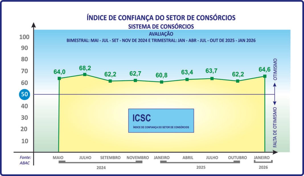 Ao alcançar a segunda melhor marca desde sua criação, o Índice de Confiança do Setor de Consórcios (ICSC), da Associação Brasileira de Administradoras de Consórcios (ABAC), atingiu, em sua nona edição, 64,6 pontos em fevereiro, ao registrar oscilação positiva de 2,4 pontos sobre o de novembro, seguindo acima dos 60 pontos.